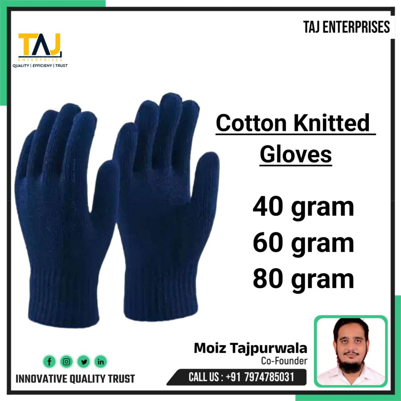 #TAJENTERPRISES #cottongloves #cottonknittedgloves #suppliers #manufactures #madeinindia #joinus #safety #karam #udhyogi #neosafe #alkosign #safetynet #safetyjacket #safetygloves #work #india A glove is a garment covering the hand, with separate sheaths or openings for each finger including the thumb. Gloves protect and comfort hands against cold or heat, damage by friction, abrasion or chemicals, and disease; or in turn to provide a guard for what a bare hand should not touch.