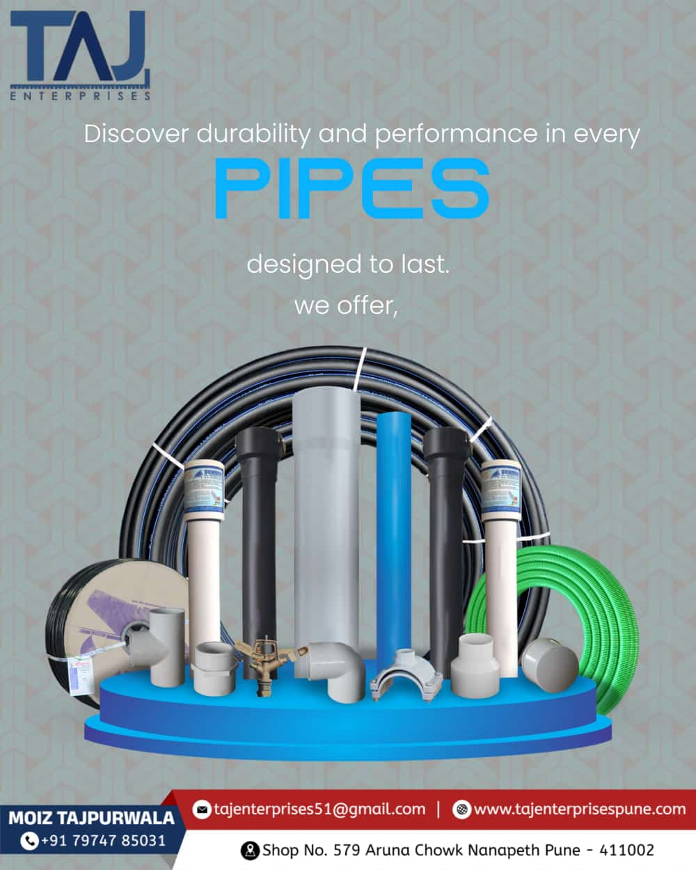 #TAJENTERPRISES #industrialmaterialsuppliers #pvcpipes #upvcpipes #cpvcpipes #pvcelbow #upvctee #india #suppliers #joinindia #watertank #pvcclamp #kitecpipes #brassballvalves #pvcballvalves #upvcfittings #drainagepipes #drainagepipefittings